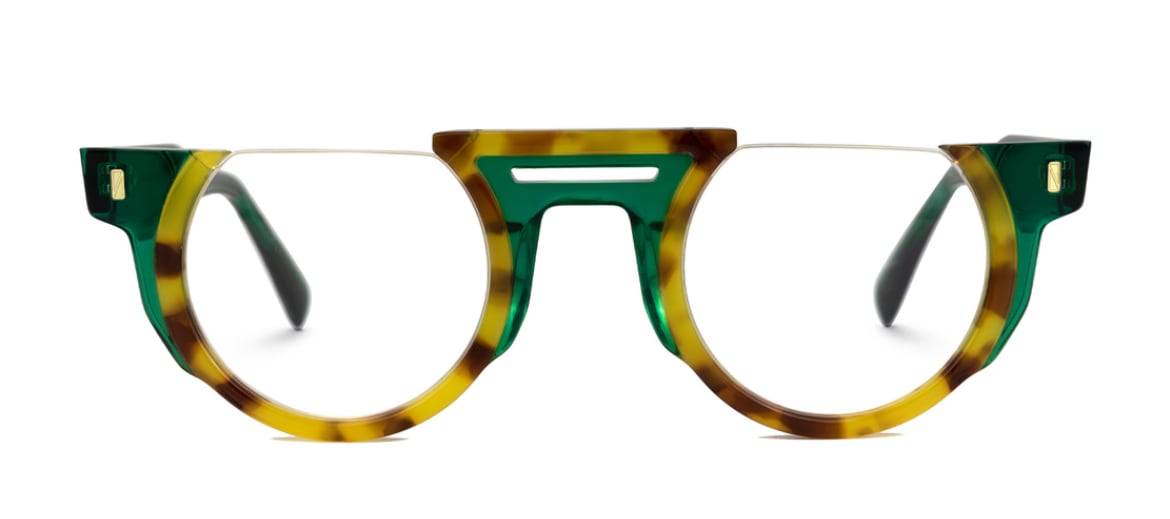 グリーンとベッコウ柄の配色が個性的。