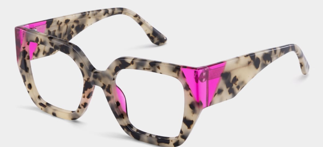 人気のダルメシアン柄と人気のピンクポイントの合体番。アセテート素材。 ビッグフレームで小顔交換も期待できそう。