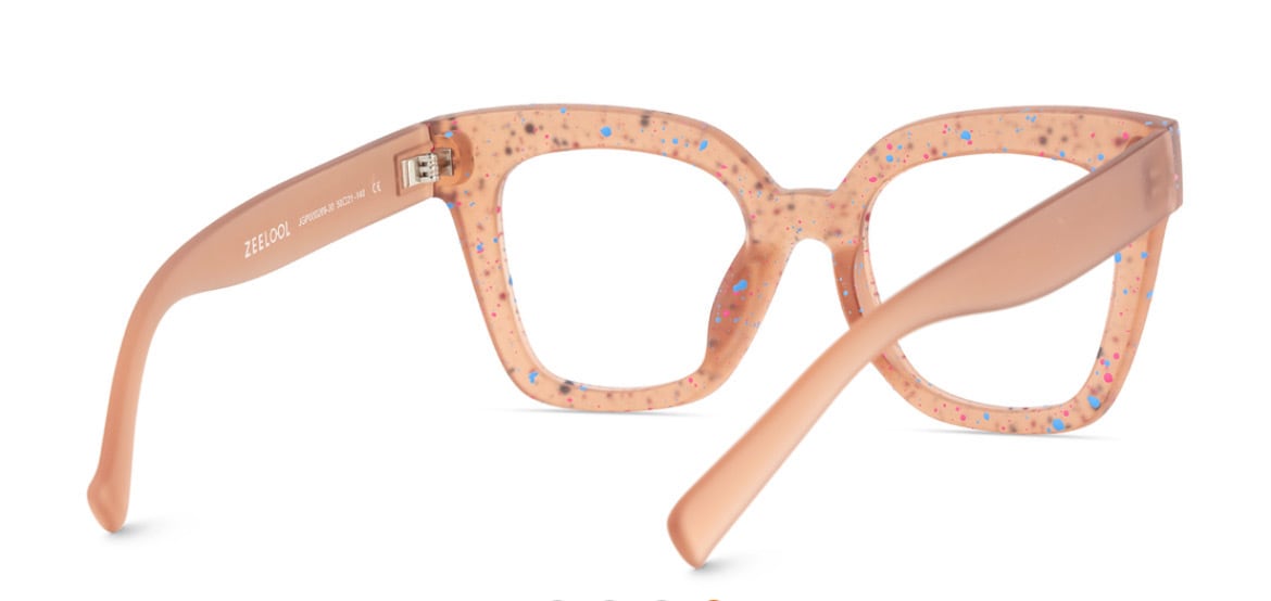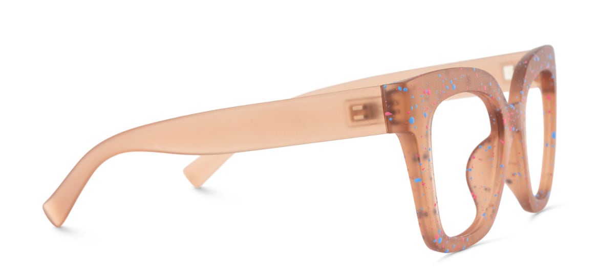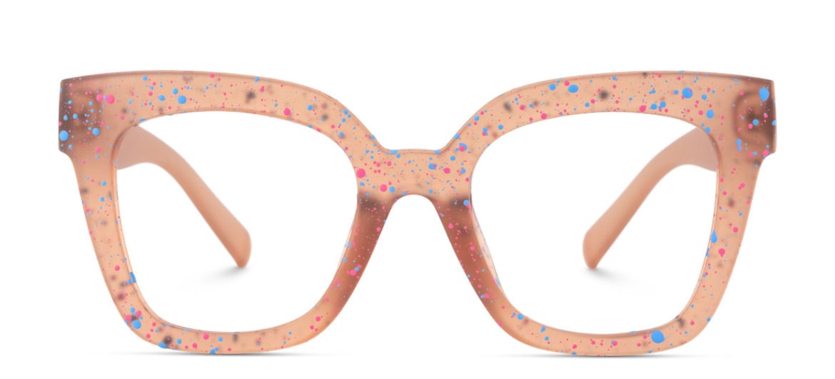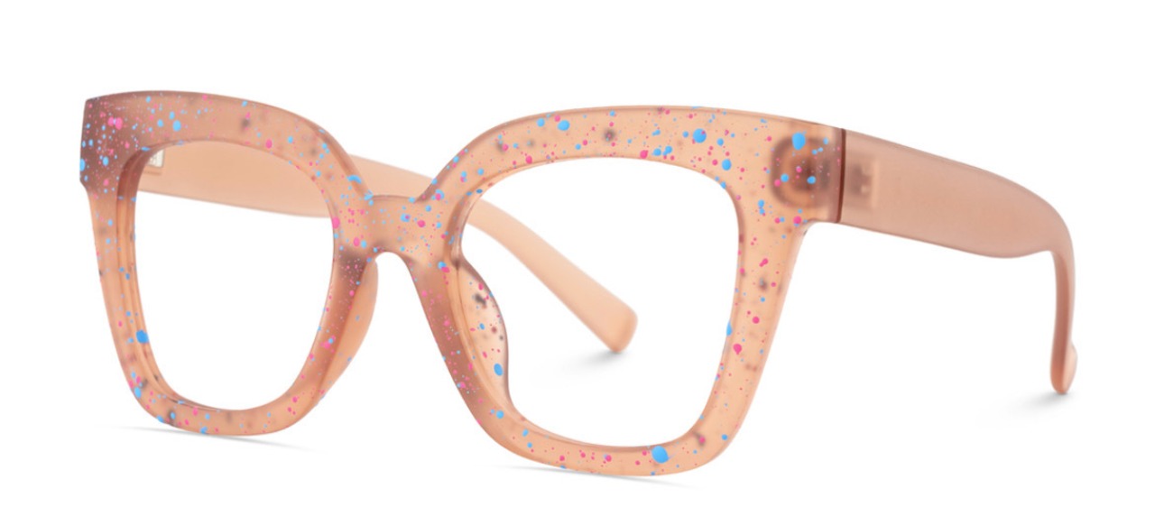 ペンキ飛ばしプリントが可愛い。 マットなピンクベージュのフレーム。 軽さも魅力。アセテート素材。